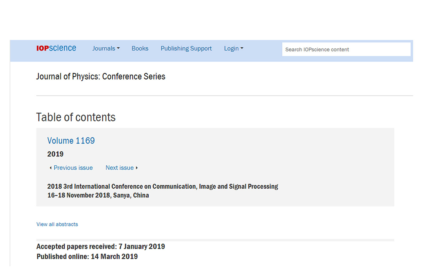 • CCISP 2016 - 2019 conference proceedings have been published in Journal of Physics: Conference Series (JPCS)(ISSN: 1742-6596), and indexed by EI Compendex & Scopus!